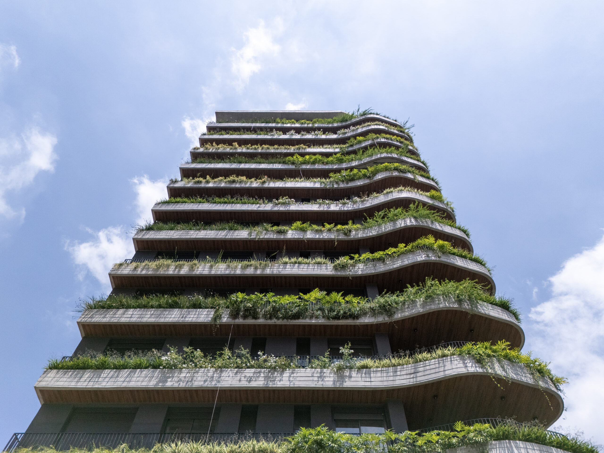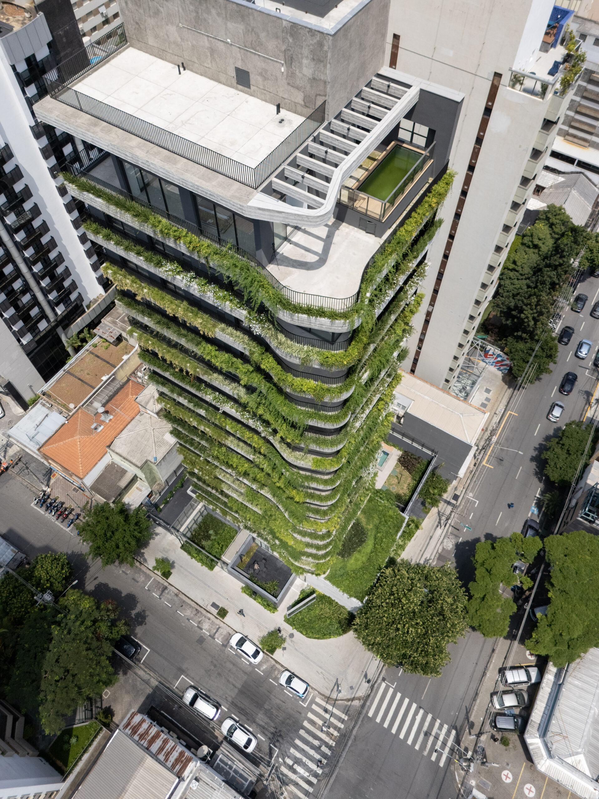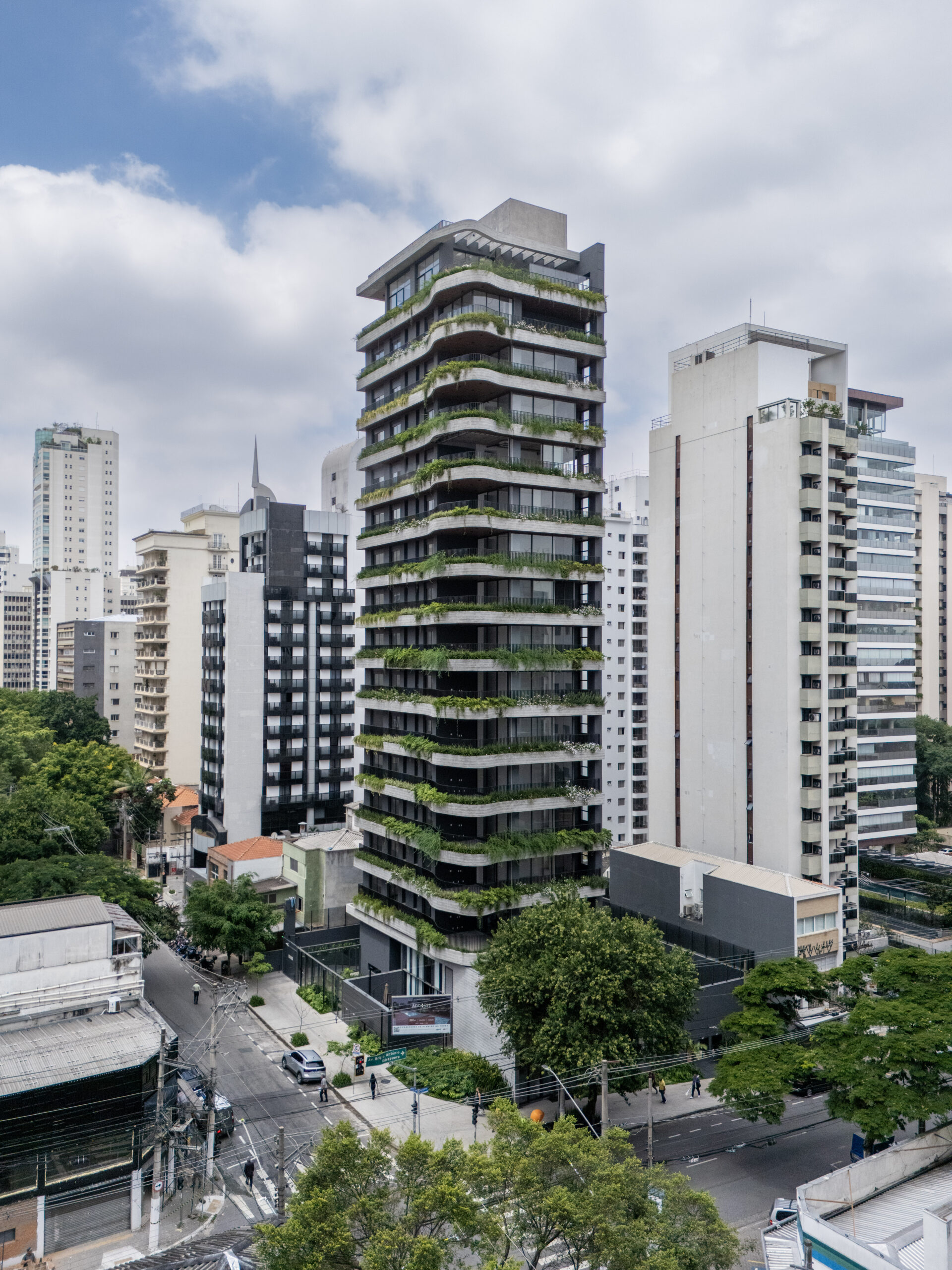 A torre residencial de 13 andares tem sua identidade marcada pelas linhas sinuosas nas varandas, solução que possibilita uma continuidade entre as fachadas da esquina, além de trazer uma sensação de amplitude e verticalidade. O prédio é uma composição dos elementos curvos, em concreto aparente, e caixas que abrigam o programa dos apartamentos, marcadas grandes caixilhos. Jardineiras foram implantadas ao longo dos terraços e ao se escalonar nas fachadas integram o projeto à massa arbórea da rua.