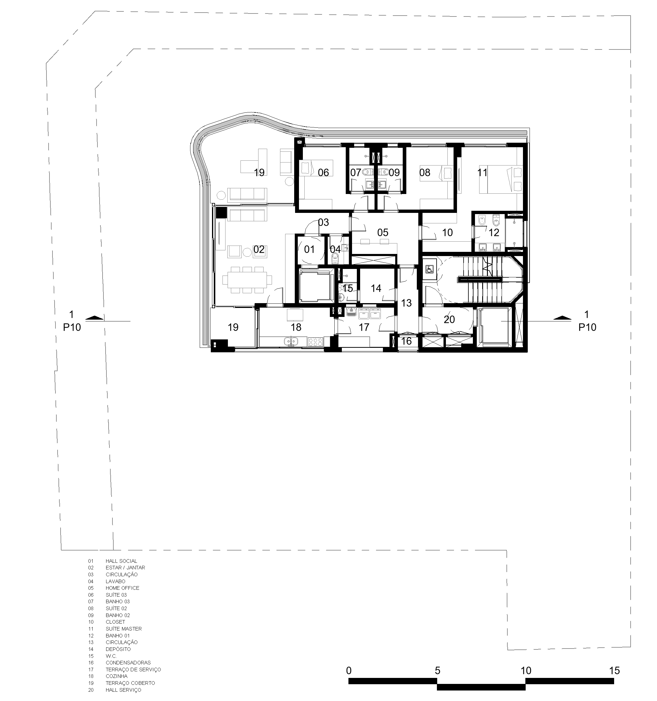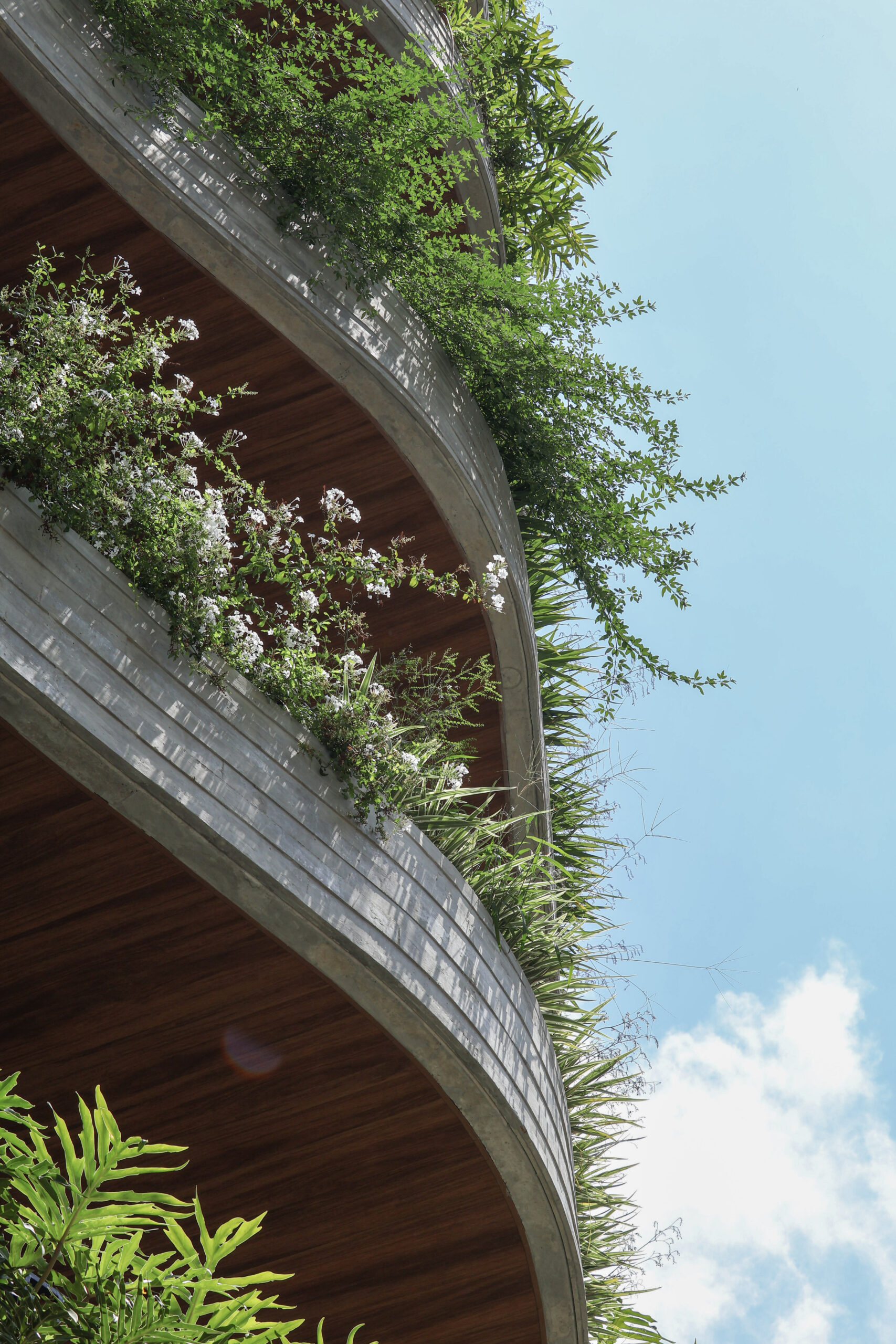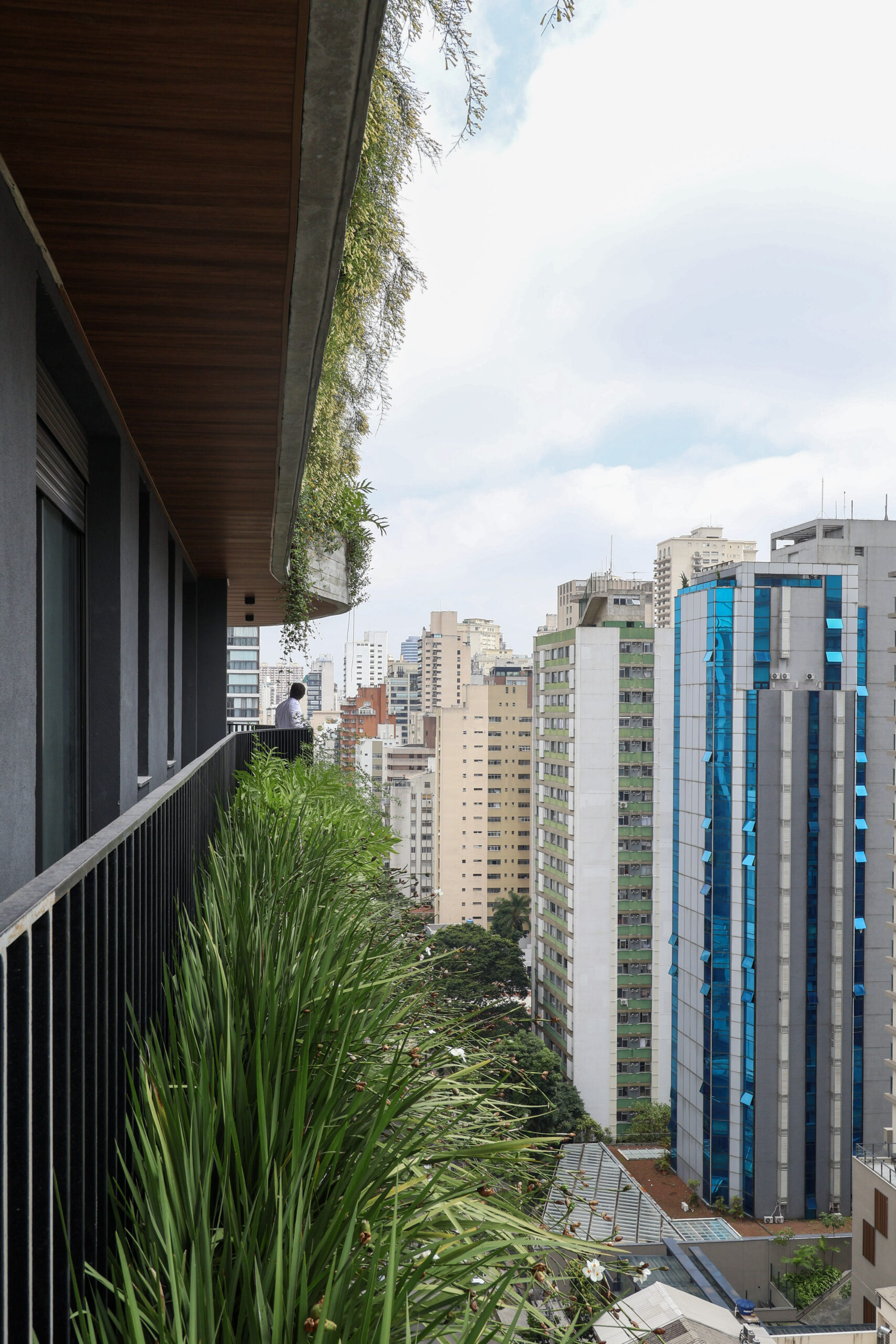 A torre residencial de 13 andares tem sua identidade marcada pelas linhas sinuosas nas varandas, solução que possibilita uma continuidade entre as fachadas da esquina, além de trazer uma sensação de amplitude e verticalidade. O prédio é uma composição dos elementos curvos, em concreto aparente, e caixas que abrigam o programa dos apartamentos, marcadas grandes caixilhos. Jardineiras foram implantadas ao longo dos terraços e ao se escalonar nas fachadas integram o projeto à massa arbórea da rua.