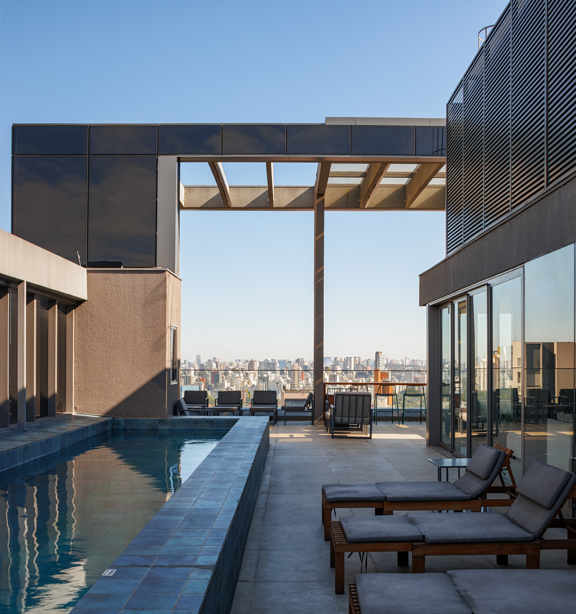 A torre residencial de 22 andares acomoda 137 apartamentos compactos, entre 21m² e 39m², planejados para assegurar privacidade, insolação adequada e vistas amplas. As unidades corporativas compõem um embasamento expressivo, com áreas de descompressão sobre as lajes, enquanto o lazer do residencial ocupa dois pavimentos na cobertura, permitindo aos moradores o acesso privilegiado ao skyline.