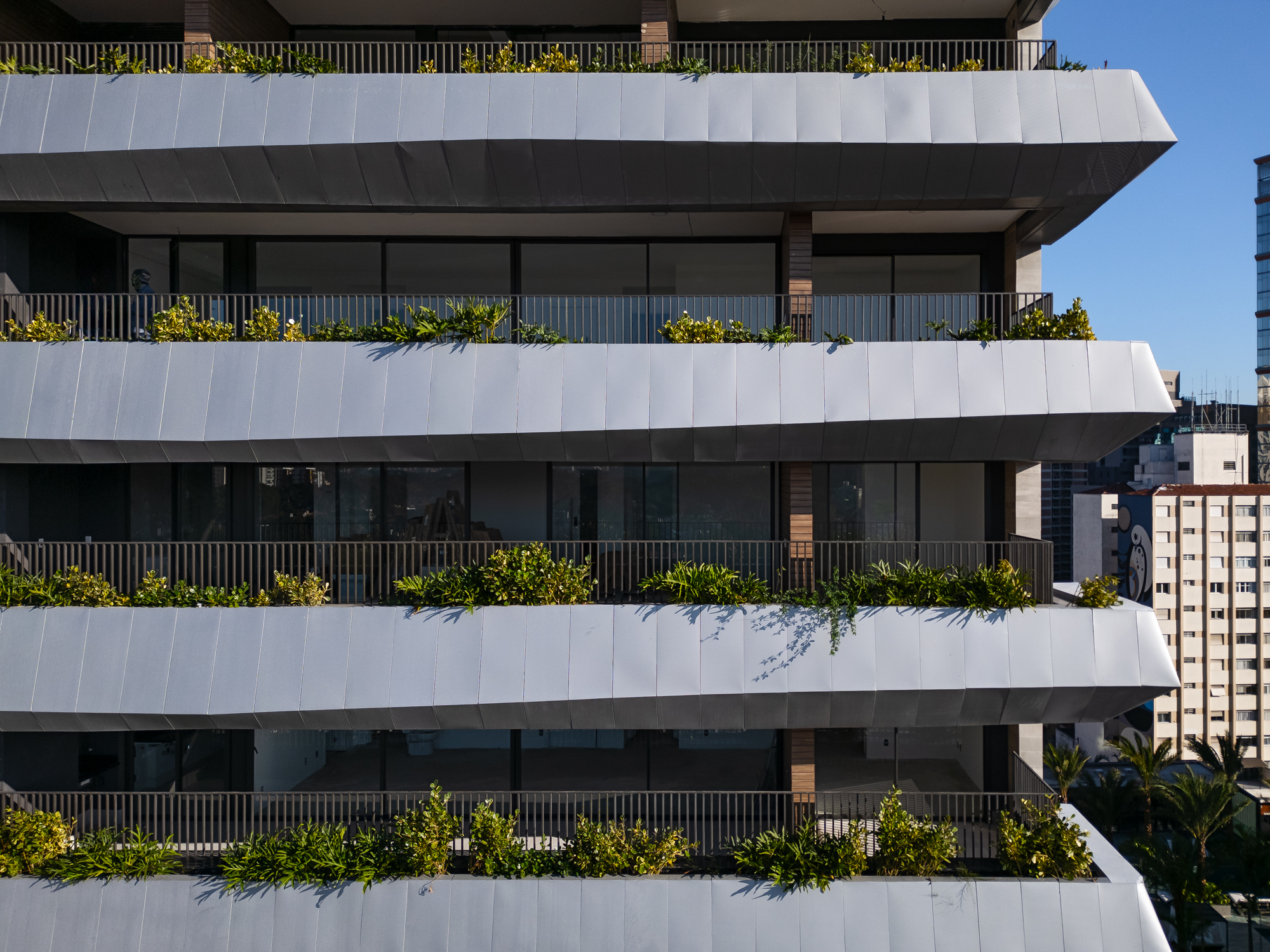 A linguagem arquitetônica do edifício é definida por sua fachada singular, onde o movimento ritmado dos terraços desenha volumes com leveza e profundidade.