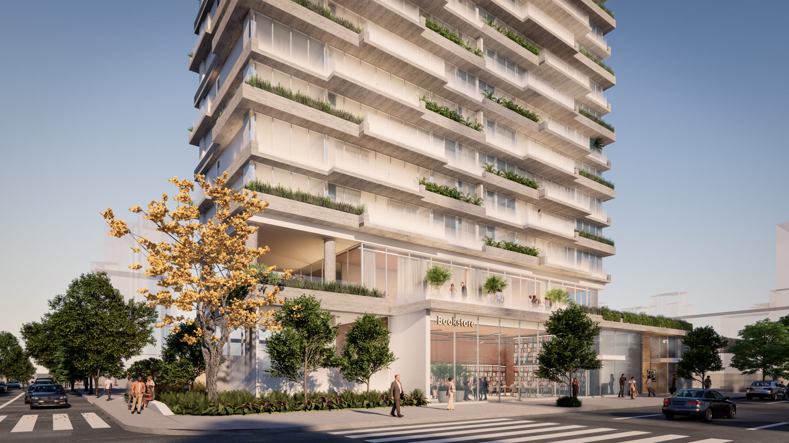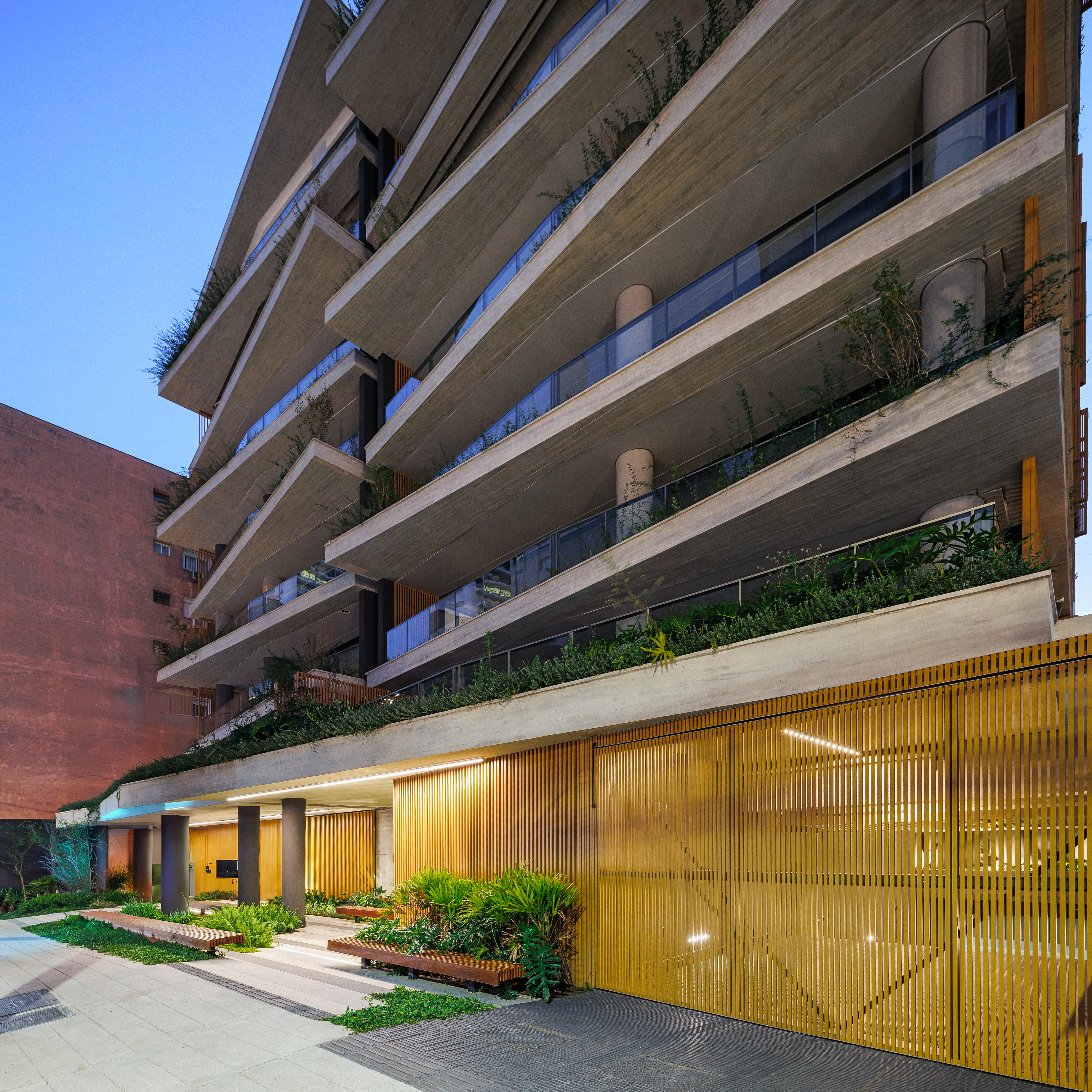 Com 24 pavimentos, a torre residencial abriga dois apartamentos por andar, com plantas de 210 m², além de uma cobertura duplex. Os layouts e planos estruturais foram pensados para proporcionar flexibilidade e personalização, com espaços bem dimensionados, conectados à iluminação natural e à ventilação. A introdução de jardineiras com vegetação nativa pontua a fachada com camadas de verde, incorporando a biofilia como elemento do morar contemporâneo e criando uma relação íntima entre natureza e arquitetura que humaniza e suaviza a escala urbana.